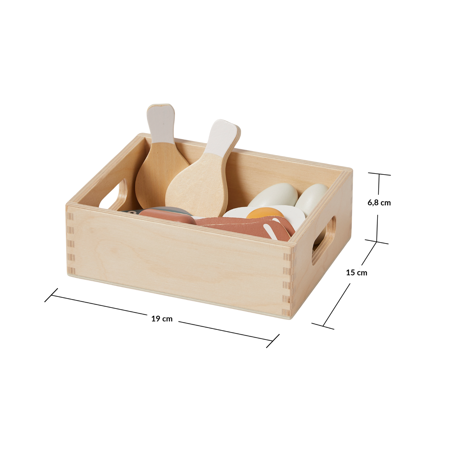 Let your little one become familiar with ingredients and cooking techniques with this set of long-lasting, wooden toy food. For instance, your young chef will learn cause and effect when you pretend to break the eggs and make two perfect sunny-side up versions – one for you and one for me. With this wooden Fish & Meat set, your child can serve a delicious breakfast, lunch, or dinner for two. In the wooden carte is a set of juicy steaks, fresh fish, fried eggs with bacon and sausages, hard-boiled eggs, and chicken drumsticks. All these wooden treats are perfectly sized for little hands to grip.